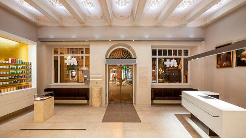 Im Anklang an typische historische Apothekenmaterialien, wie das Messing der Mörser, das Porzellan der Salbengefäße und das Holz der Einrichtung wurden im Verkaufsraum Gold und weißer Mineralwerkstoff, im Backoffice Räuchereiche eingesetzt.