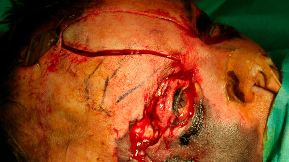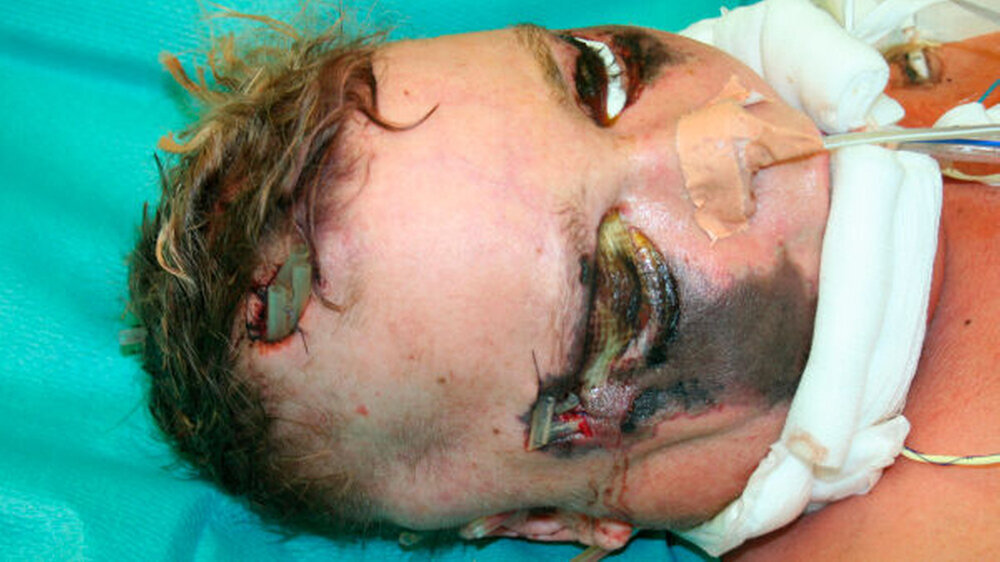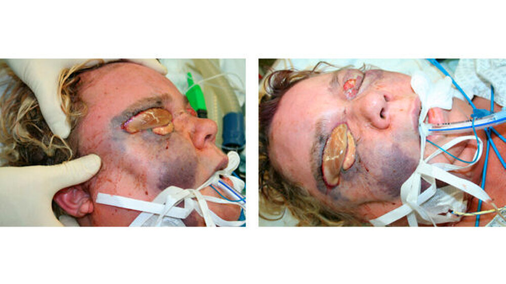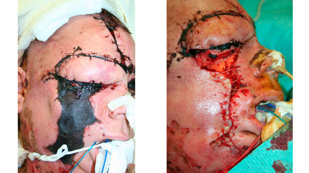 Ein weitgehender Lidverlust rechts und ein Teilverlust links schienen zunächst unabwendbar. Würde es den MKG-Chirurgen nicht gelingen, die Lider zu erhalten oder wiederherzustellen, drohte der Verlust der Augen! Doch erste Rettung war in Sicht: Bereits vier Tage später erfolgte die Anlage eines Stirnlappens zur Abdeckung des Auges nach Verlust des rechten Oberlids, links wurden die Nekrosen abgetragen und mit Kunsthaut versorgt.