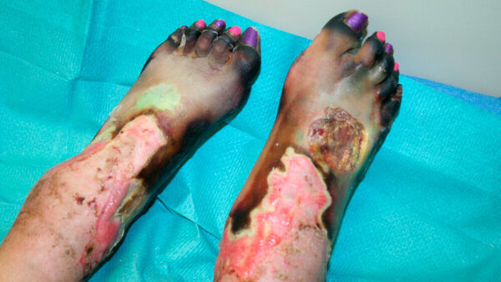 Hervorzuheben bleibt, dass die Patientin für eine kurze Zeit dialysiert werden musste und schließlich die Unterschenkelamputation nicht zu umgehen war. Später mussten dann auch die Fingerendglieder entfernt werden. Nach allgemeiner Besserung wurde die Patientin mit einer Unterschenkelprothese versorgt.