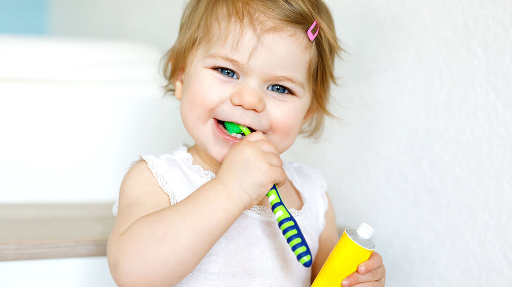 Ab dem ersten Geburtstag gilt dann: Zweimal tägliches Zähneputzen mit einer reiskorngroßen Menge Zahnpasta mit Fluorid. Für Zahnärztinnen und Zahnärzte ist es wichtig, den Eltern im Rahmen der Früherkennungsuntersuchung die Bedeutung der genauen Dosierung der Zahnpasta zu erläutern, um eine Fluorid-Überdosierung zu vermeiden. Zahnpasten aus Tuben mit kleinerer Öffnung, neutraler Farbe und neutralem Geschmack sollten vorwiegend empfohlen werden; sie sollten für alle Kinder zwischen null und sechs Jahren 1.000 ppm Fluorid enthalten.