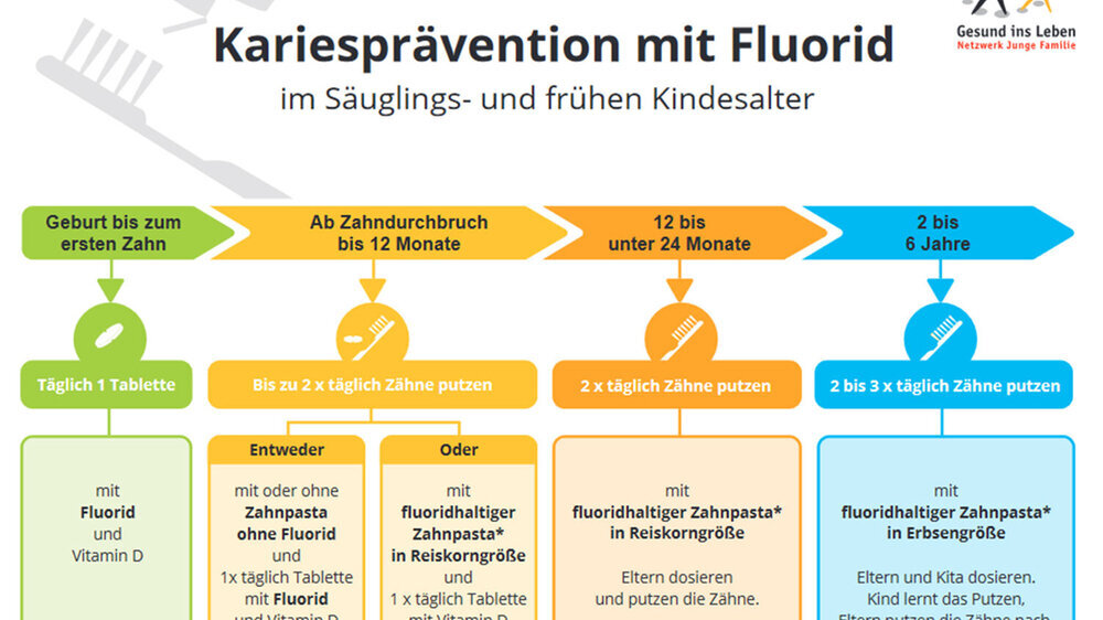 Bereits ab der Geburt wird Fluorid empfohlen - zunächst als tägliche Tablette in Kombination mit Vitamin D. Ab Durchbruch des ersten Zahns bis zum Ende des ersten Lebensjahres wird das Kind behutsam an das Zähneputzen herangeführt. Eltern haben für die Fluoridanwendung zwei Wahlmöglichkeiten: Entweder geben sie weiter Fluorid und Vitamin D in Tablettenform und beginnen das erste Zähneputzen ohne Zahnpasta oder mit einem fluoridfreien Präparat.