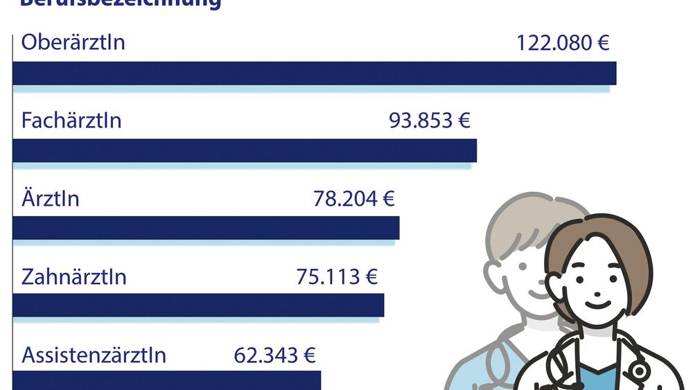 Das übliche Gehalt eines Arztes wurde anhand der oben unter „Gehaltsniveaus nach Beruf“ aufgeführten Methodik geschätzt.