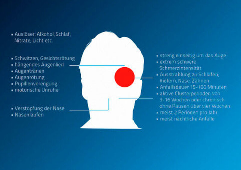 Der Clusterkopfschmerz gehört zu den trigeminoautonomen Kopfschmerzen, eine Gruppe von Erkrankungen, bei denen es zu sehr starken, in Attacken auftretenden, meist nur kurz andauernden Schmerzattacken kommt, die obligat mit autonomen Begleitsymptomen wie zum Beispiel einem tränenden Auge, Schwitzen, einer Hautrötung oder einer Lidschwellung einhergehen.