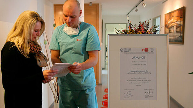 Hintergrund: Die Dresdner Universitätszahnklinik bietet schon lange fakultative Hospitationen in Zahnarztpraxen im Studiengang Zahnmedizin für vorklinische Semester an, doch ab sofort gibt es auch das Angebot "Kooperationspraxen der zahnmedizinischen Ausbildung". von dem auch Julia Zimmermann profitiert: Studierende können zwischen dem neunten und zehnten Semester freiwillig an einer mehrtägigen Hospitation in einer akademischen Ausbildungspraxis teilnehmen.