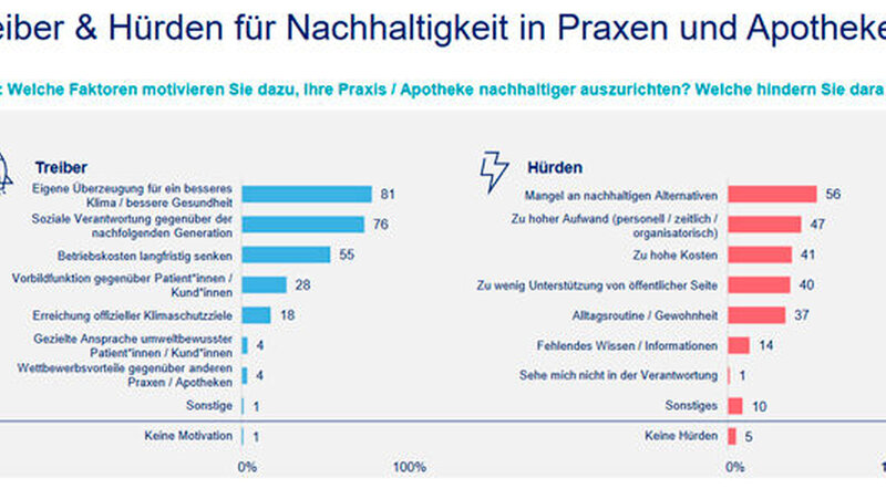 Wie die Studie zeigt, hat Nachhaltigkeit für 61 Prozent der Teilnehmenden eine „hohe”, für weitere 28 Prozent sogar eine „sehr hohe Relevanz”. Auf einer Skala von eins (nicht nachhaltig) bis zehn (sehr nachhaltig) bewerten die Heilberuflerinnen und Heilberufler ihre Praxen und Apotheken durchschnittlich mit 6,2. Die größten Treiber für mehr Nachhaltigkeit sind dabei die eigene Überzeugung oder die soziale Verantwortung gegenüber der nachfolgenden Generation.