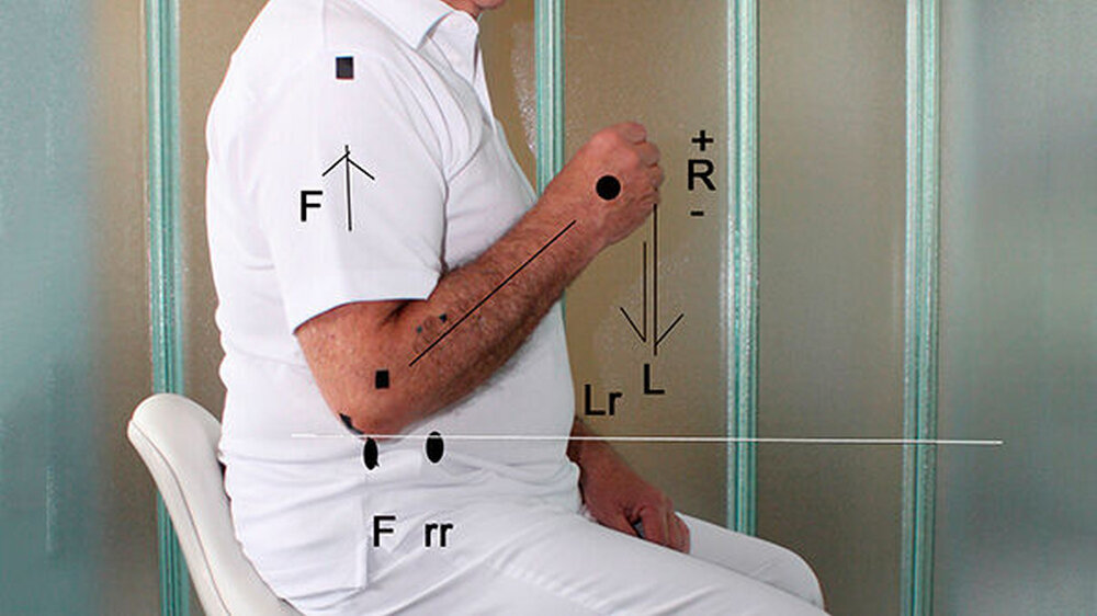 Proprioceptive Bewegungsstudien für Fingerpräzisionsarbeit (ohne Mikroskop) führen zur Positionierung „R“ der arbeitenden Finger in Herzhöhe und in Körpermitte. Dies ist eine Position, in der sich die Agonisten und Antagonisten der Unter- und Oberarmmuskulatur möglichst nahe dem muskulären Gleichgewicht befinden,Je nachdem, ob die Behandlung im Ober- oder Unterkiefer geschieht, wird die Arbeitshöhe von der Referenzhöhe abweichen.