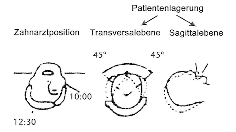 Der Patient liegt horizontal, bei OK-Okklusalebene +/- 90 Grad und UK-Okklusalebene +/- 45 Grad zur Horizontalen. Der Zahnarzt befindet sich hinter dem Patientenkopf.