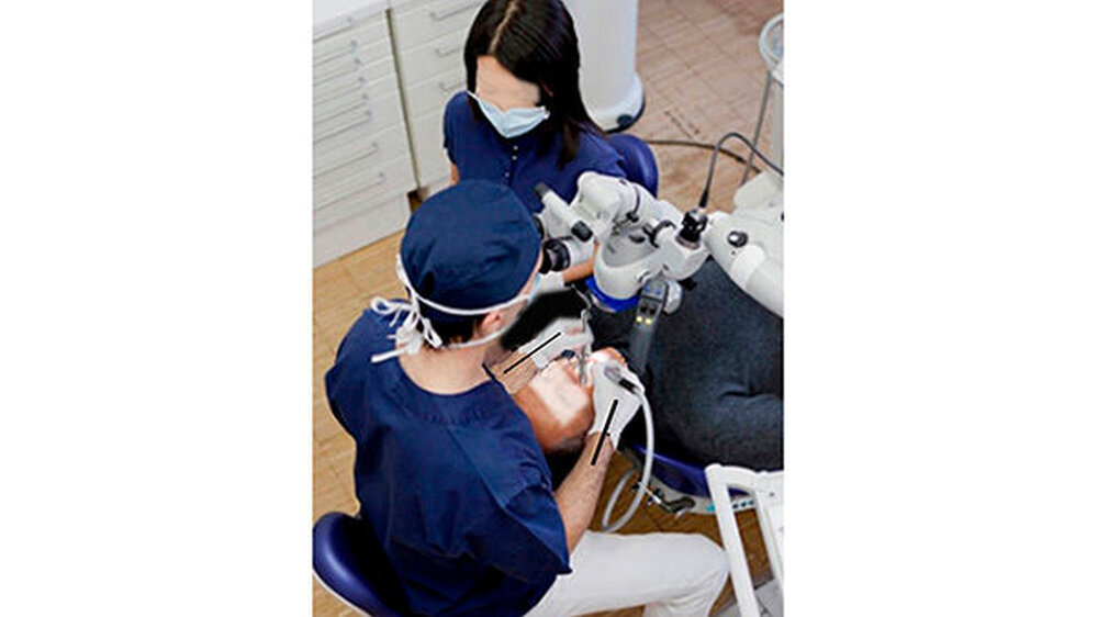 Der stabilen Zahnarzt-Patienten-Mikroskop-Beziehung folgt logischerweise die Zuordnung der benötigten Arbeitsgeräte, die Zuordnung der ZFA im kleinen Greifraum des Zahnarztes und in seinem peripheren Gesichtsfeld. Das Arbeitsumfeld kann so ohne großen visuellen Kontrollverlust auf das Arbeitsobjekt erreicht werden. Die ZFA kann das Operationsfeld über einen Bildschirm in ihrem Sichtfeld (wie hinter dem Behandler an der Wand) oder über einen Mitbetrachtertubus kontrollieren, um effektiv assistieren zu können.