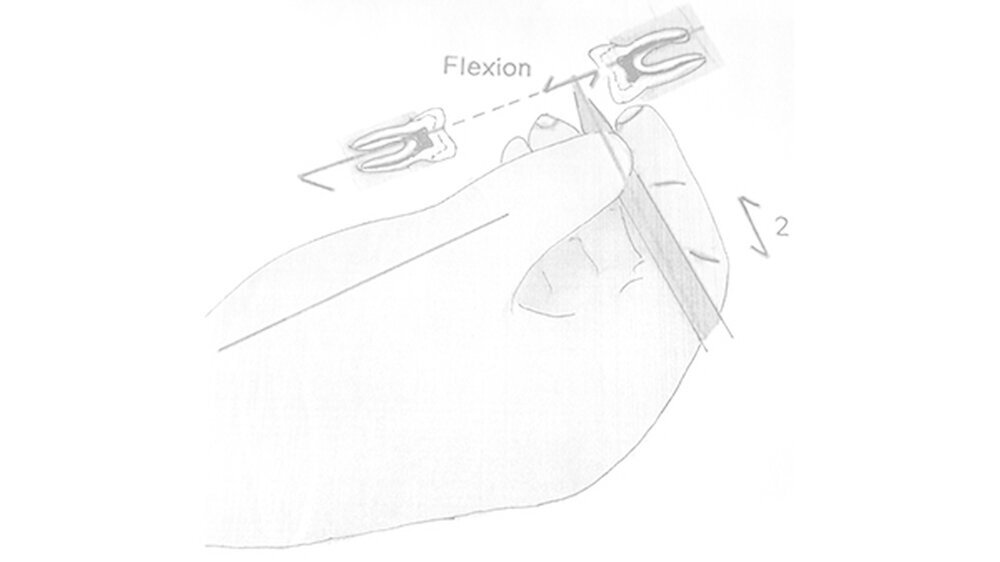 Die einfachste und präziseste Fingerbewegung im Millimeterbereich und in Körpermitte ist die Flexionsbewegung bei geradem Handgelenk. Sie bewegt das Instrument in sagittaler Richtung, das heißt auf den Behandler zu oder von ihm weg. Es ist logisch, die Kanalrichtungen entsprechend den jeweils einfachsten Fingerbewegungen zuzuordnen, um für die delikate Behandlung der Wurzelkanäle eine maximale Voraussetzung für Feintaktilität zu schaffen. Die Anpassung des Arbeitsobjekts an die Fingerbewegungen entspricht der Patientenlagerung.