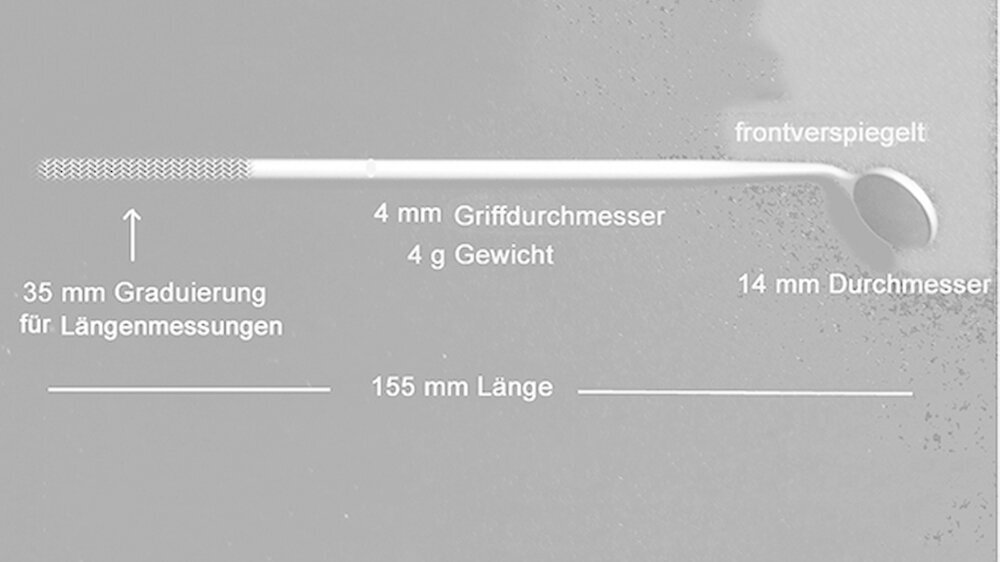 Der physiologische Augen-Objekt-Abstand ist am OPMI nicht notwendig, da der Arbeitsabstand eingestellt wird. Die zentrale Sicht auf das Arbeitsobjekt- die Zugangskavität und der Kanal - geschieht ausschließlich indirekt über den Spiegel. Für die reflektierte Sicht benutzen wir einen kleinen, leichten, frontverspiegelten Spiegel mit einem Durchmesser von 14 mm und 4 g Gewicht, ohne Gewinde zwischen Hand- und Arbeitsteil. Rückverspiegelte Spiegel sind ungeeignet, da Doppelbilder entstehen (Abbildung 5).