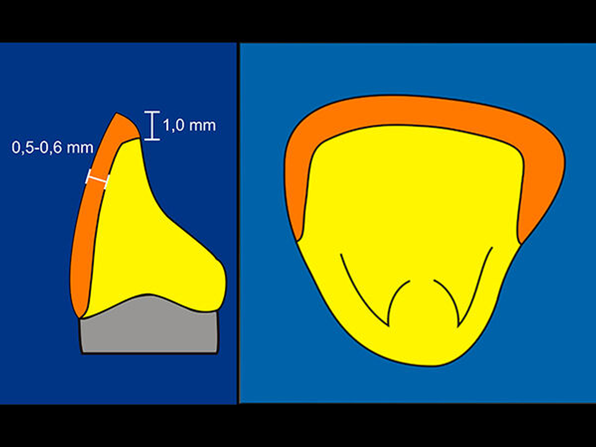 Rinke und Ziebolz versorgten 101 Zähne mit extendierten Frontzahn-Veneers aus heißgepresster Glaskeramik (Cergo, Dentsply-Sirona). Unterschiedliche Präp-Designs nutzten folgende Präparationstiefen (Abb. 1-2): Hohlkehle labial 0,3 mm, Labialabtrag mind. 0,5 mm, inzisaler Abstand 1,0 mm, Inzisalkante leicht angeschrägt, horizontale Rillenschnitttiefe 0,5 mm. Bei der Präparation kam es zur Freilegung von Dentin mit Anteilen von 50 Prozent und mehr, vor allem im zervikalen Bereich und bei fehlgestellten Zähnen. Aufgrund der unterschiedlichen Dentinflächen wurde die Zahnhartsubstanz mit Dentin-Bonding vorbereitet, die Keramikflächen wurden nach HF-Ätzung silanisiert, mit Bonding versehen und mit dualhärtendem Kompositzement befestigt.