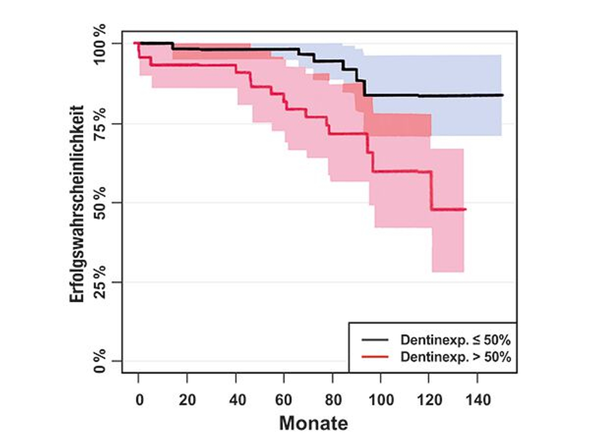 Die Nachuntersuchungen zeigten nach sieben Jahren mittlerer Beobachtungszeit eine Overall-Überlebensrate von 93,6 Prozent. Häufigste Komplikation war die Dezementierung. Die spezifische Überlebensrate der extendierten Veneers lag bei 95 Prozent im OK, bei 91,2 Prozent im UK. Fälle mit mehr als 50 Prozent exponiertem Dentin zeigten im Vergleich zu weniger als 50 Prozent Dentinanteil kein erhöhtes Risiko vollständiger Veneer-Verluste. Die Erfolgsrate von Veneers mit weniger als 50 Prozent exponiertem Dentin betrug 94,3 Prozent – hingegen sank die Erfolgsrate mit mehr als 50 Prozent Dentinanteil auf 71,8 Prozent (Abb. 3).
