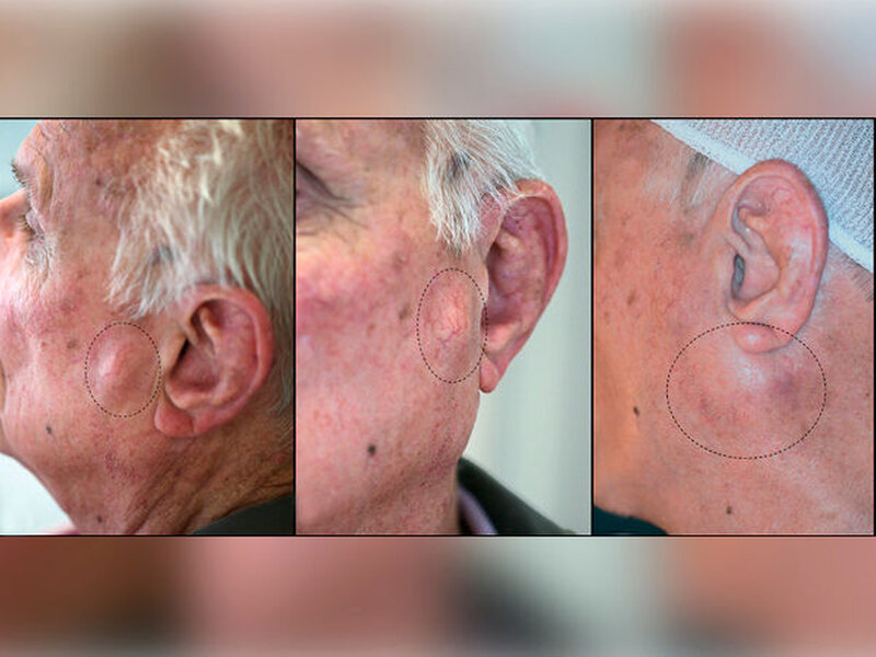 Ein 81-jähriger Mann stellte sich mit einer seit drei Wochen progredienten, indolenten Raumforderung präaurikulär links in der Klinik und Poliklinik für Mund-, Kiefer- und Gesichtschirurgie der Universitätsmedizin Mainz vor. Klinisch zeigte sich ein nicht druckdolenter Befund von palpatorisch 2 cm x 2 cm Größe im Bereich der linken Glandula parotidea (Abbildung 1). Der Patient beklagte weder eine typische Okklusionssymptomatik (Schmerzen vor und während der Nahrungsmittelaufnahme, typisch für einen Verschluss des Speicheldrüsengangs bei Sialolithiasis), noch eine Xerostomie (zum Beispiel im Rahmen eines Sjögren-Syndroms).