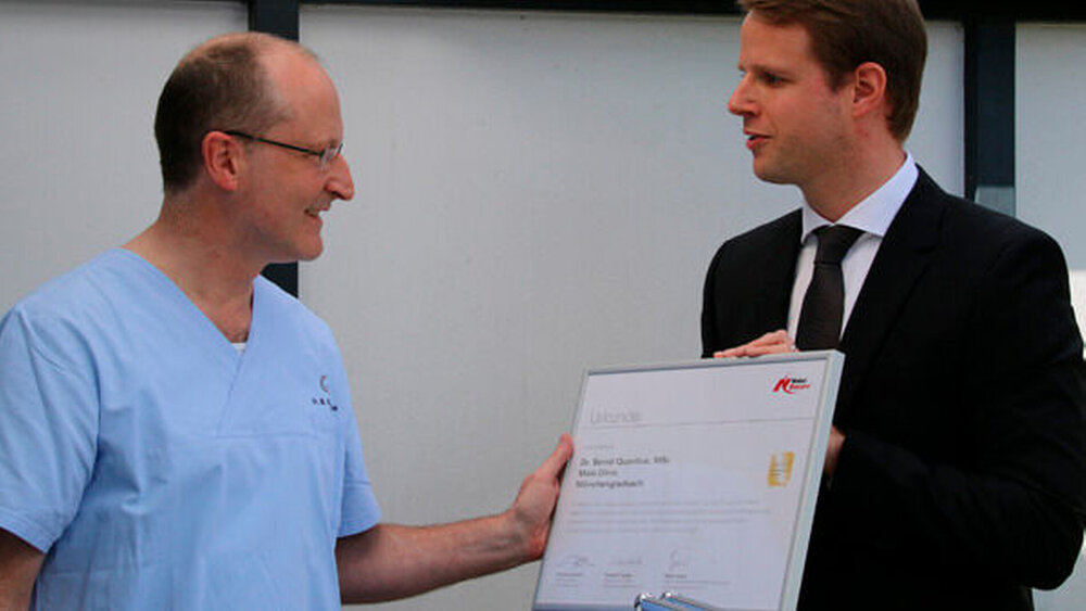 2007 traf der Mönchengladbacher Implantologe Quantius Prof. Dr. Paulo Maló zum ersten Mal bei einem Kurs in der MaloClinic in Lissabon. Die All-on-4-Methode zur Sofortversorgung des zahnlosen Kiefers mit festsitzendem Zahnersatz begeisterte ihn. Ein- bis zweimal pro Jahr absolvierte er seitdem Fortbildungen bei Maló und schulte anschließend seine Kollegen in der Praxis. Seit Anfang 2014 ist er offizieller Partner der Malo-Clinic-Gruppe. Aus dem intensiven fachlichen Austausch entwickelte sich eine Partnerschaft und Freundschaft zu Paulo und den Kollegen aus Lissabon. Quantius: „Wir sind die einzige Klinik in Deutschland, die die All-on-4-Methode nach dem Malo-Clinic-Protokoll anbietet. Das gibt unseren Patienten enorme Sicherheit und ein hohes Maß an Lebensqualität.“