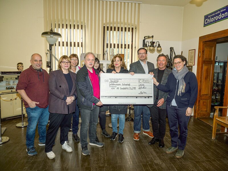 Höhepunkt des Besuchs des Arbeitskreises war die Übergabe eines Schecks in Höhe von 1.000 Euro durch deren Vorsitzende Dr. Wibke Merten. Haesler freute sich sichtlich über den dritten Scheck, den er bisher erhalten hat. Abschließend konnten die Arbeitskreismitglieder einen ersten Blick in die neue Sonderausstellung des Dentalmuseums werfen.