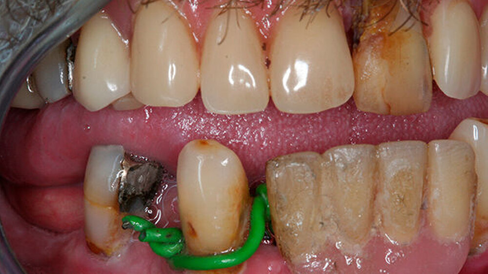 Er verzichtete auf die gebrochenen Prothesensattel im Seitenzahngebiet und befestigte nur die Unterkieferfront. "Da kann man nur mit einem bekannten Baumarkt-Slogan antworten: 'Respekt, wer's selber macht'", schreibt Dr. Dr. Josef Herbert aus Schönebeck. Letztlich hat sich der Patient aber jetzt doch für eine professionellere Gesamtlösung in der Zahnarztpraxis entschieden.