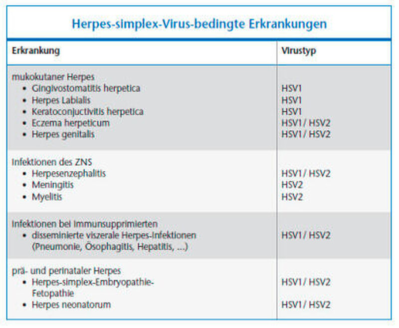 Prinzipiell können sich HSV-Infektionen in jedem Organsystem manifestieren, der Befall von inneren Organen und dem Zentralnervensystem ist selten, aber mit hohen Komplikationsraten behaftet [Gross, 2004]. Besondere Bedeutung kommt lebensbedrohenden Infektionen von Neugeborenen im Rahmes des Herpes neonatorum zu. Klinisch wird unterschieden zwischen den primären und den sekundären (rezidivierenden) Herpesmanifestationen. In der Tabelle sind die HSV-assoziierten Erkrankungen zusammengefasst [Gross, 2004].