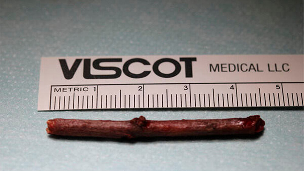 Zusätzlich wurde der Patient in den folgenden drei Tagen mit einer oralen Antibiose versorgt sowie zur täglichen Wundspülung einbestellt. Nach dieser Behandlung waren die Beschwerden zunächst leicht regredient. Unter Fortführung der oralen Antibiotikagabe zeigte sich die Beschwerdesymptomatik jedoch persistent, so dass wir uns dazu entschlossen, eine Wundinspektion in Lokalanästhesie durchzuführen. Intraoral konnte dabei ein subcutan liegender harter Gegenstand palpiert werden. Die unmittelbar folgende Schleimhautinzision brachte einen Fremdkörper in Form eines 4,5 cm langen Aststücks (Abbildungen 3 und 4) zum Vorschein.