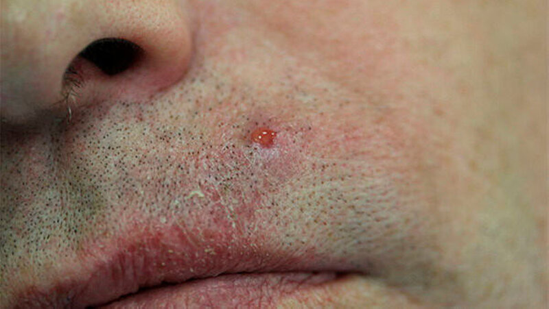 Da er sich bei dem Sturz bis auf eine kleine punktuell blutende Hautverletzung im Bereich der Oberlippe links keine größeren Verletzungen zugezogen hatte, schenkte er dem Vorfall vorerst keine weitere Beachtung. In den nächsten Tagen entwickelte sich daraus jedoch eine schmerzhafte Wangenschwellung links mit persistierendem Eiteraustritt aus der kleinen Wunde im Bereich der linken Oberlippe (Abbildung 1). Dies veranlasste ihn schließlich am fünften Tag nach dem Unfall einen HNO-Arzt aufzusuchen, der ihn zur Behandlung einer beginnenden Wangenphlegmone und zum Ausschluss einer Mittelgesichtsfraktur in unsere Klinik überwies.
