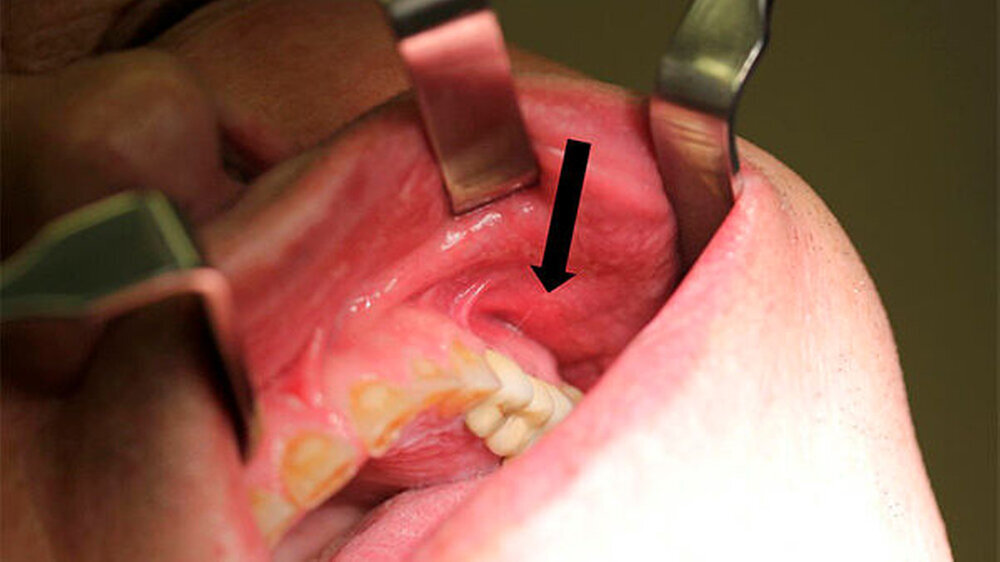 Die klinische Untersuchung zeigte intraoral eine derbe, druckdolente, nicht verschiebliche, abgekapselte Schleimhautschwellung vestibulär regio 23 bis 27 (Abbildung 2) mit putridem Ausfluss aus einem Fistelgang nach extraoral im Bereich der Oberlippe links.