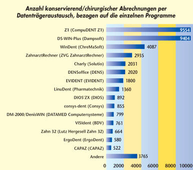 Im Vergleich zum Vorjahr haben Z1 (CompuDENT Z1) und DS-WIN-Plus (Dampsoft) ihren Anteil an den elektronisch eingereichten KCH-Abrechnungen um 1,9 Prozent beziehungsweise um 1,5 Prozent weiter gesteigert. Z1 hat somit DS-WIN-Plus überholt. An dritter Stelle steht wieder WinDent von der Firma ChreMaSoft mit 9,7 Prozent. Somit wurden 54,8 Prozent der DTA-Abrechnungen mit einem dieser drei Programme erstellt. Acht Programme liegen über der 3-Prozent-Marke, hinter der Darstellung „Andere“ verbergen sich 60 verschiedene Abrechnungssysteme.