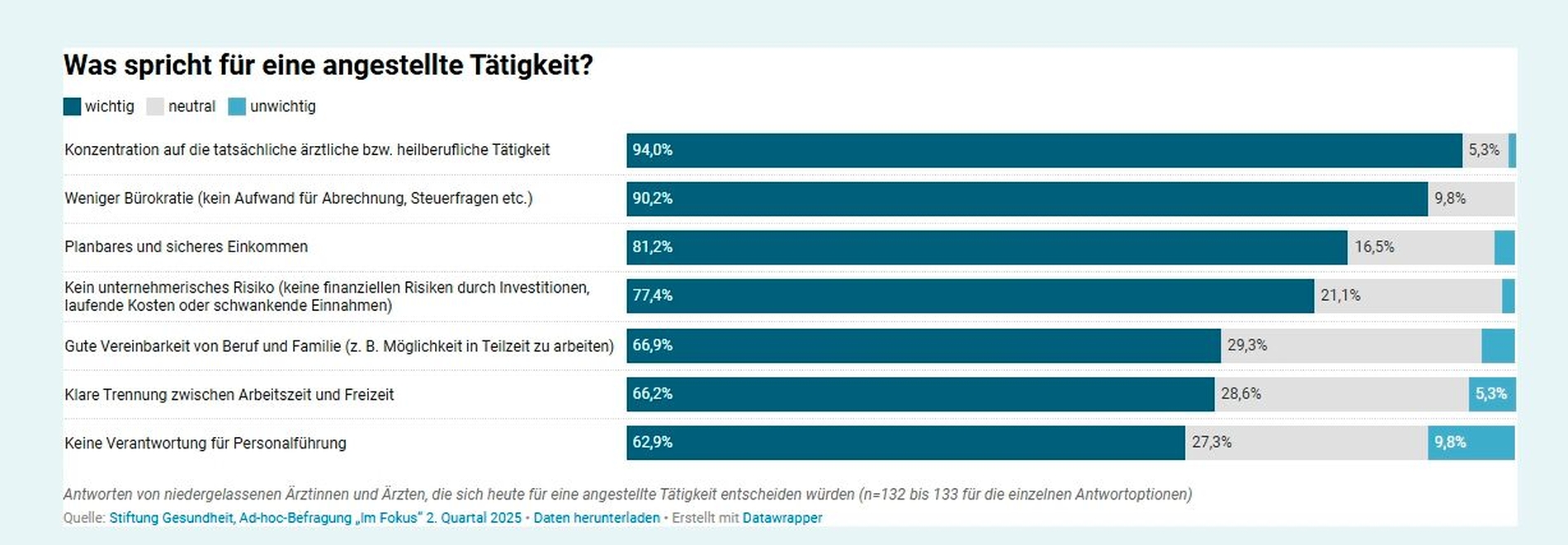 Als Hauptargument für eine angestellte Tätigkeit nannten die Befragten, dass ihnen diese Beschäftigungsform die Möglichkeit gebe, sich auf die tatsächliche ärztliche Tätigkeit zu konzentrieren (94,0 Prozent). Als zweitstärkstes Argument gaben neun von zehn Ärzten „weniger Bürokratie“ an, da sie sich als Angestellte nicht selbst um Abrechnung, Steuerfragen und ähnliche Themen kümmern müssten.