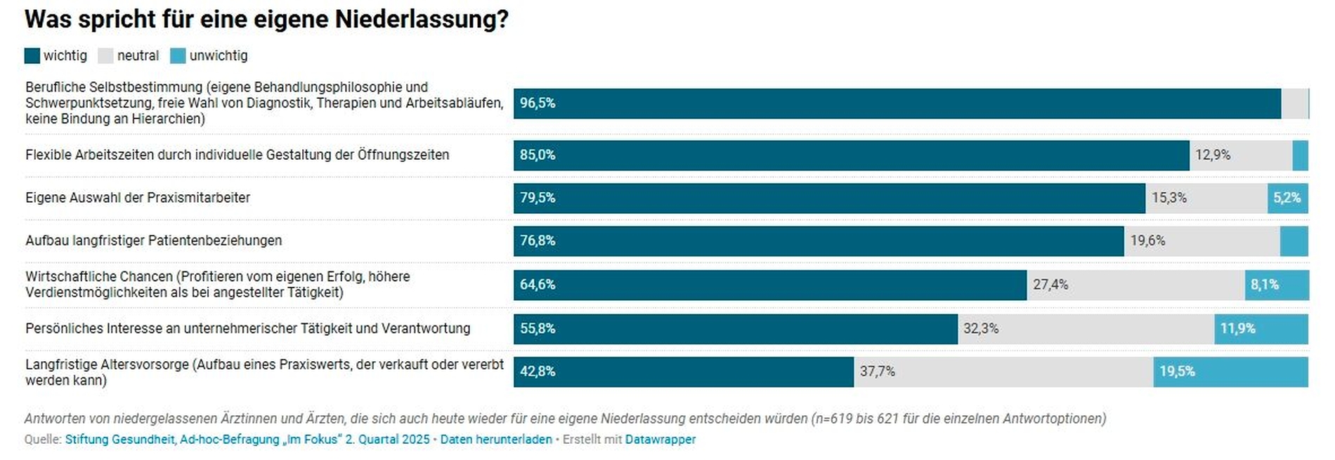 Aber auch wenn das Interesse an angestellten Tätigkeiten wächst, würden sich mehr acht von zehn niedergelassenen Ärzte heute erneut für eine eigene Praxis entscheiden. Als Vorteil nennen sie dabei die berufliche Selbstbestimmung, die 96,5 Prozent wichtig finden: Die eigene Praxis gebe ihnen die Möglichkeit, eine individuelle Behandlungsphilosophie zu verfolgen und sowohl die diagnostische und therapeutische Vorgehensweise als auch administrative Arbeitsabläufe frei zu gestalten.