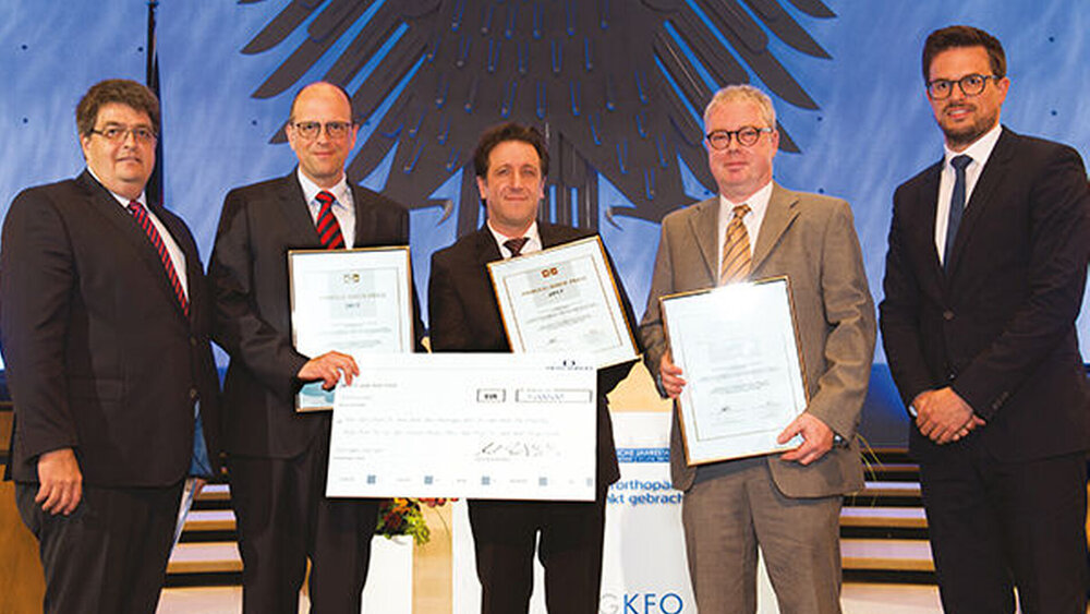 Im besonderen Ambiente des "Alten Bundestages" gratulierte DGKFO-Präsidentin Professor Dr. Ursula Hirschfelder dem vierköpfigen Siegerteam. Dentaurum-Geschäftsführer Axel Winkelstroeter und Regionalverkaufsleiter Matthias Kühner überreichten einen Scheck in Höhe von 5000 € sowie die zugehörigen Urkunden.