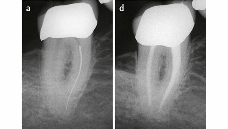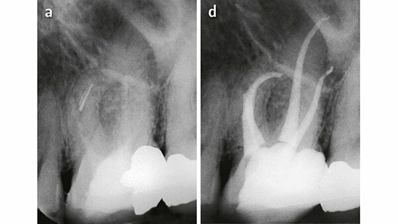 In einer Nachfolgeuntersuchung zu unserer eigenen Studie stellte Helbling (2014) fest, dass es keinen Unterschied bezüglich des klinischen Erfolgs nach ≥ 3 Jahren gab, wenn das frakturierte Instrument nicht vollständig entfernt werden konnte und/oder es anlässlich des Entfernungsversuchs zur Perforation gekommen war, verglichen mit Zähnen mit erfolgreicher Instrumentenentfernung (Abb. 4 und 5). Das Untersuchungsgut lässt außerdem die Vermutung zu, dass die Stärke der Kanalkrümmung die Erfolgswahrscheinlichkeit bezüglich Instrumentenentfernung beeinflusst. Wegen der kleinen Anzahl der Fälle sind diese Ergebnisse jedoch nicht abschließend.