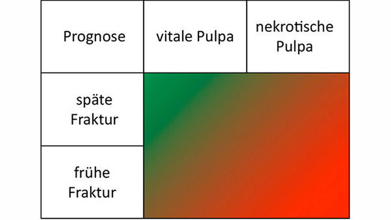Die langfristige Prognose für einen Zahn nach Instrumentenfraktur ist abhängig vom Grad der Infektion und vom Zeitpunkt der Instrumentenfraktur (Simon et al. 2008; Ungerechts et al. 2014). Je später die Fraktur passiert, desto größer die Wahrscheinlichkeit, dass der Kanal chemomechanisch schon gut aufbereitet ist und demzufolge weniger Mikroorganismen und/oder nekrotisches Gewebe vorhanden sind (Abb. 3). Je fortgeschrittener die Infektion (entzündete Pulpa, nekrotische Pulpa, periradikuläre Aufhellung), desto mehr und tiefer im Kanal liegende Mikroorganismen sind zu erwarten. Außerdem sind bei Revisionen tendenziell resistentere Keime zu erwarten als bei Ersteingriffen.