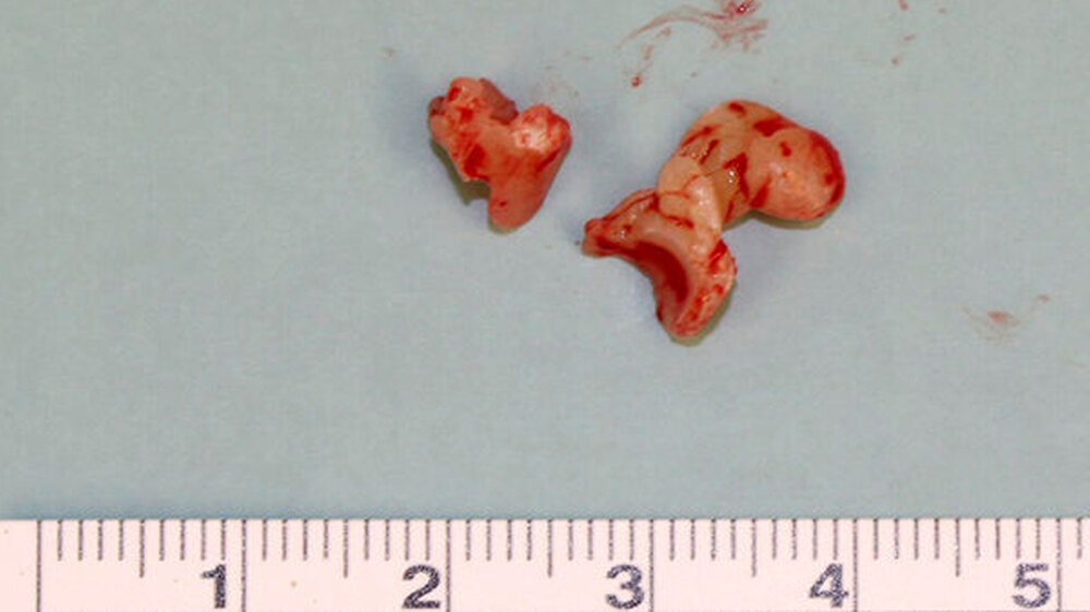 In Intubationsnarkose konnte der Fremdkörper aus dem rechten Sinus maxillaris über einen osteoplastischen offenen Zugang vestibulär regio 014 bis 015 geborgen werden (Abbildung 3). Die Mund-Antrum-Verbindung regio 026 wurde mittels eines Rehrmannlappens verschlossen. Gleichzeitig erfolgte die Entnahme von Proben aus beiden Kieferhöhlen. Die Abbildung 4 zeigt den kunststoffartigen Fremdkörper im Sinne von Füllungsmaterial. Die postoperative Röntgenkontrolle dokumentiert die Entfernung des Fremdkörpers (Abbildung 5) in toto.