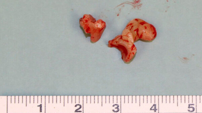 Ein anschließend erfolgtes Gespräch mit dem Patienten konnte nicht klären, wie das Füllungsmaterial in die Kieferhöhle gelangt ist. Histologisch ergab sich eine entzündungsbedingte beidseitige polypöse ödematöse Kieferhöhlenschleimhaut. Am dritten postoperativen Tag entließen wir den Patienten bei sanatio per primam intentionem in die ambulante Nachsorge.