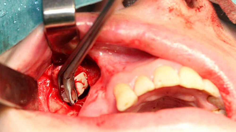 Anamnestisch berichtete der Patient neben dem nasalen Flüssigkeitsausfluss während des Schluckakts über ein seit Längerem bestehendes Druckgefühl im Bereich der rechten Kieferhöhle. Die weitere Anamnese war unauffällig. Klinisch wurde eine ausgeprägte oroantrale Fistel mit putridem Ausfluss regio 026 diagnostiziert. Die rechte Kieferhöhle zeigte sich perkussionsempfindlich.