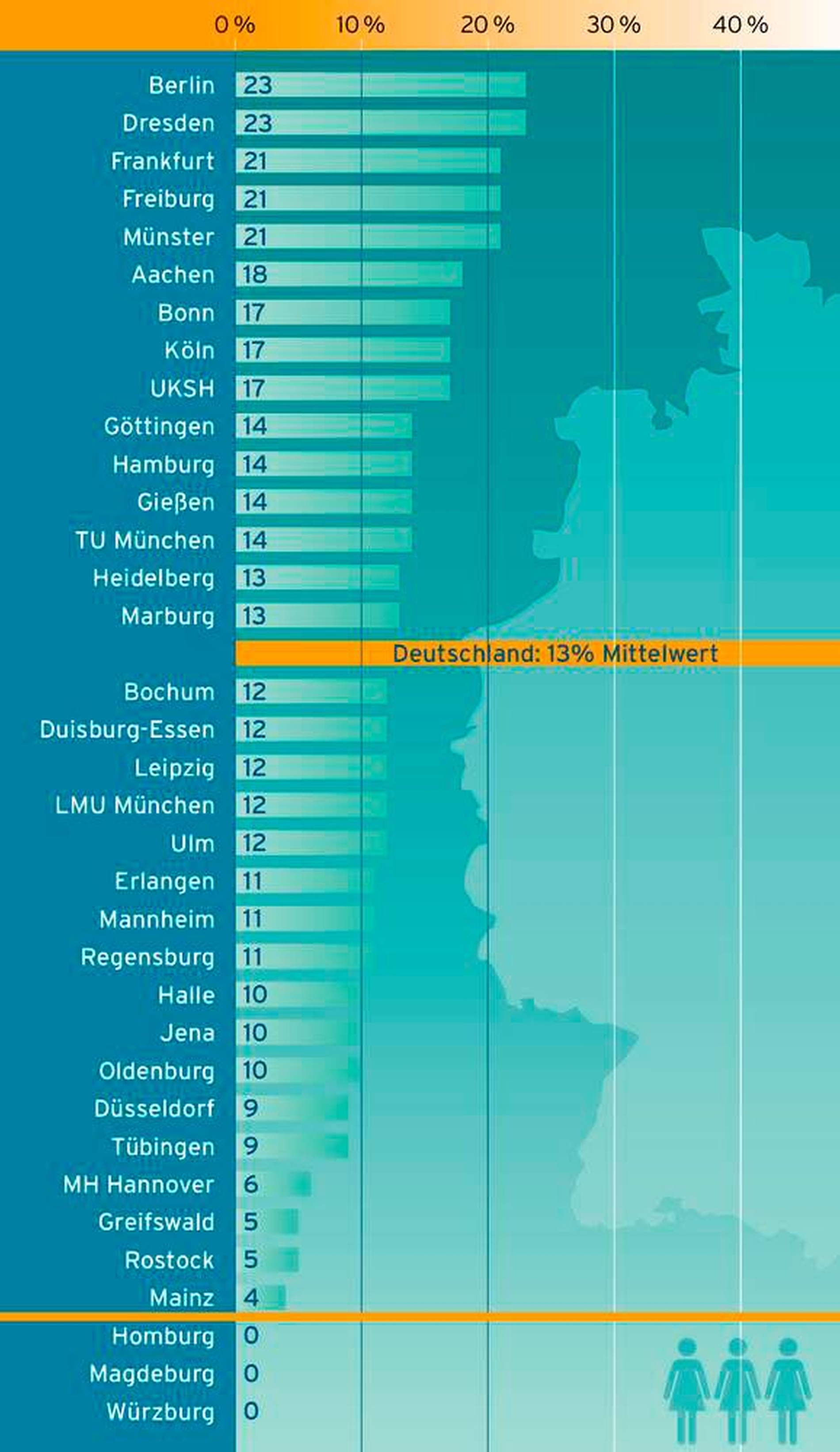 Die aktuelle Ranking der 35 deutschen Universitätskliniken zeigt, dass es nur geringe Verschiebungen im Vergleich zu 2016 gab: In drei Universitätskliniken - Homburg, Magdeburg und Würzburg - ist derzeit keine Frau in einem der geprüften Fächer auf einer Spitzenposition (2016 war dies in Homburg, Greifswald und Mannheim der Fall). An der Spitze lagen 2016 Hamburg, Münster, Berlin, Dresden und Freiburg - 2019 sind es Berlin und Dresden mit einem Anteil von inzwischen 23 Prozent an Frauen in Spitzenpositionen, gefolgt von Frankfurt am Main, Freiburg und Münster mit 21 Prozent.