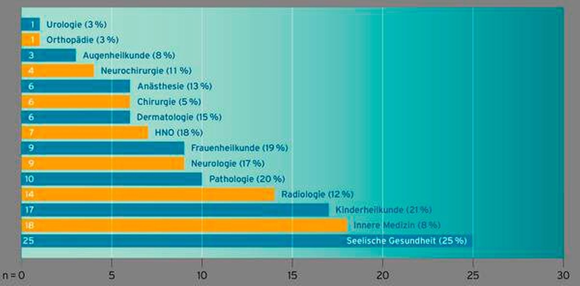 Der Frauenanteil in den einzelnen Fächern ist zudem sehr unterschiedlich: Die Fächer der Seelischen Gesundheit verzeichnen einen Frauenanteil von 25 Prozent, gefolgt von der Kinderheilkunde mit 21 Prozent, lediglich drei Prozent gibt es in der Urologie und der Orthopädie.