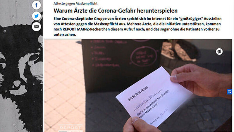 Aktuell listet die Gruppe auf ihrer Website namentlich 2.000 Unterstützer, darunter mehrere hundert Ärzte und Zahnärzte. Dass etliche von ihnen auf ihrer Praxiswebsite auf die Möglichkeit hinweisen, Patienten Gefälligkeitsatteste gegen die Maskenpflicht zu geben, zeigen die Reporter in ihrem Beitrag. Sie fragen daraufhin verdeckt per E-Mail bei mehr als 40 Zahnärzten und Ärzten stichprobenartig eine solche Bescheinigung an - explizit nicht aus medizinischen Gründen, sondern weil man die Maskenpflicht als "Corona-Irrsinn" persönlich ablehne.