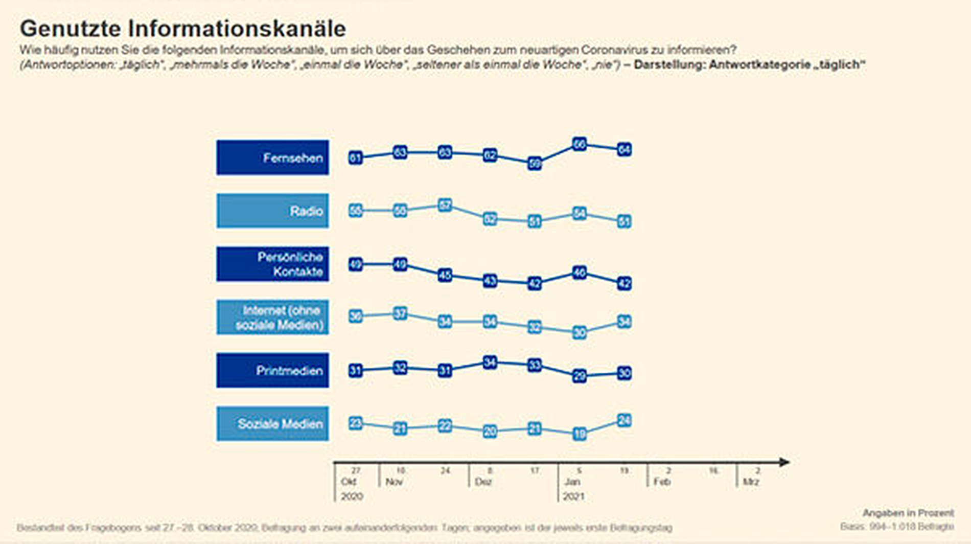 24 Prozent der Deutschen geben laut der neuesten Befragungswelle (19./20.1.2021) des BfR-Corona-Monitors an, „täglich” Social Media-Kanäle zu konsumieren, um sich über das Geschehen zum neuartigen Coronavirus zu informieren. Das ist der Höchstwert, seit im Oktober 2020 die Frage in die Befragung aufgenommen wurde.