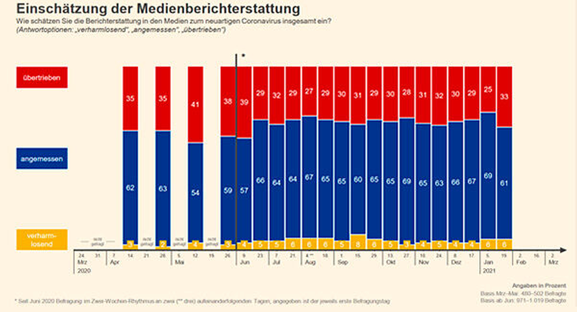 Fest steht hingegen, dass ein zunehmender Anteil der Befragten des BfR-Corona-Monitors die Berichterstattung zum Pandemiegeschehen generell zunehmend als unangemessen wahrnimmt. Einer von drei Befragten hält aktuell die Berichterstattung für „übertrieben”, 6 Prozent halten sie hingegen für „verharmlosend”. Diese Werte waren im Mai deutlich schlechter.