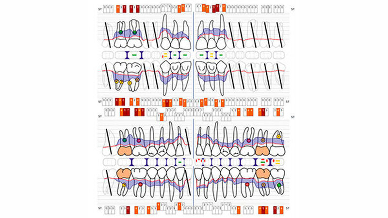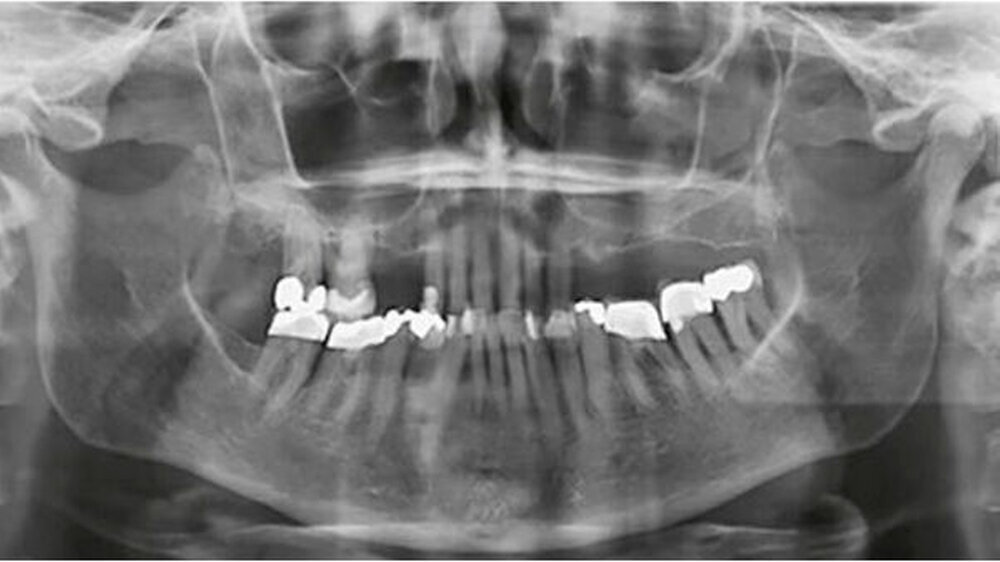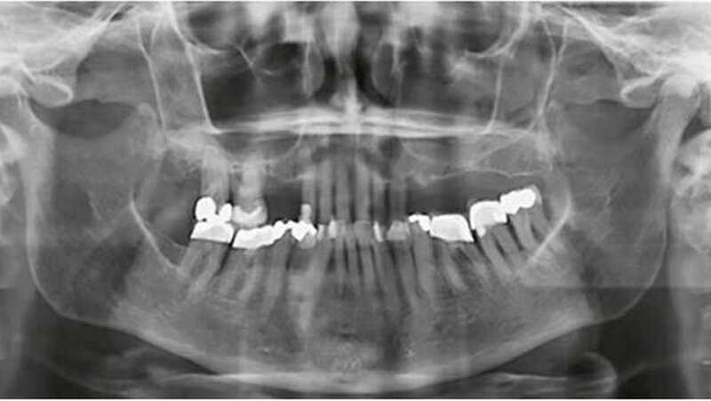 Als sich die Patientin in einer allgemeinmedizinisch stabilen Situation befand, erfolgte eine Vorstellung mit Verdacht auf einen oralen Fokus in der Klinik für Mund-, Kiefer- und Gesichtschirurgie sowie in der Klinik für Zahnerhaltungskunde & Parodontologie des Universitätsklinikums Freiburg. Die Befundung der Patientin zeigte eine schwere chronische generalisierte Parodontitis mit Sondierungstiefen bis zu 7 Millimeter und einen generalisierten horizontalen Knochenabbau (Abb. 3 und 4). Dabei ist zu beachten, dass der Parodontalstatus einen Zustand nach Scaling und Wurzelglätten sowie Antibiose und antiinflammatorischer Therapie darstellte. Um eine rezidivierende Infektion zu vermeiden, wurde eine strenge Extraktionsplanung vorgenommen, basierend auf der Prognoseeinschätzung von Nunn et al. (2012).