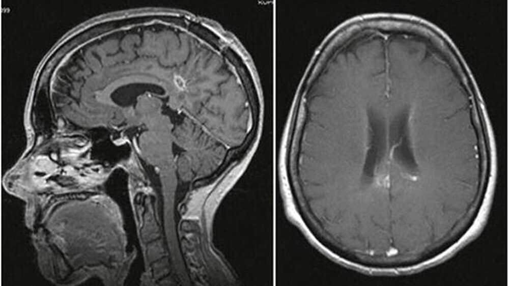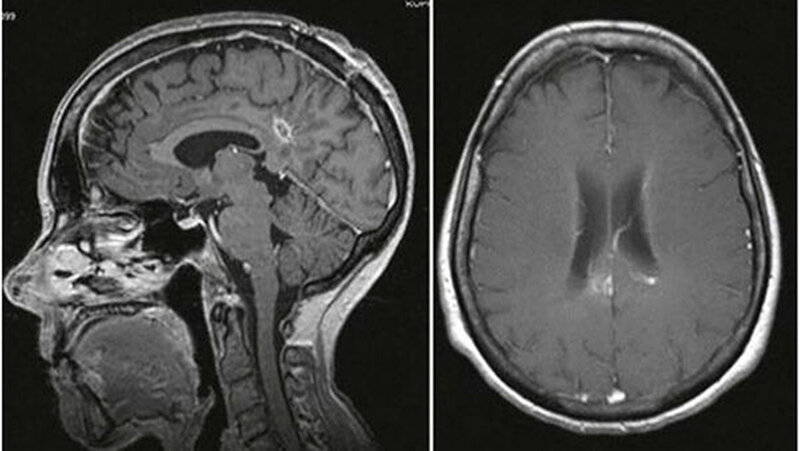 Eine Computertomografie (CT) ergab eine raumfordernde Läsion in der rechten Hemisphäre. Eine anschließende Magnetresonanztomografie (MRT) stellte eine 17 × 15 × 25 Millimeter umfassende Läsion mit einem perifokalen Ödem dar (Abb. 1).