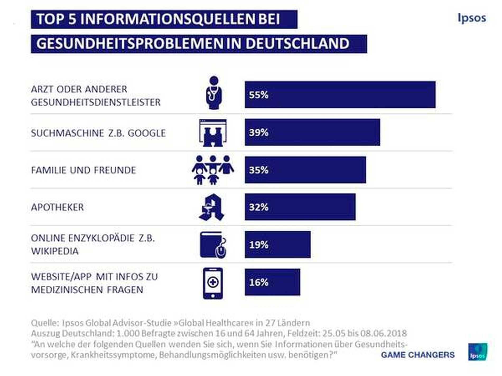 Eine aktuelle internationale Studie des Markt- und Sozialforschungsinstituts Ipsos zeigt: Die Deutschen sind traditionell. Die meisten informieren sich über Gesundheitsvorsorge, Krankheitssymptome oder Behandlungsmöglichkeiten nach wie vor beim Arzt (55 Prozent). Erst dann folgen "Dr. Google" (39 Prozent), Familie und Freunde (35 Prozent) und der Apotheker (32 Prozent).