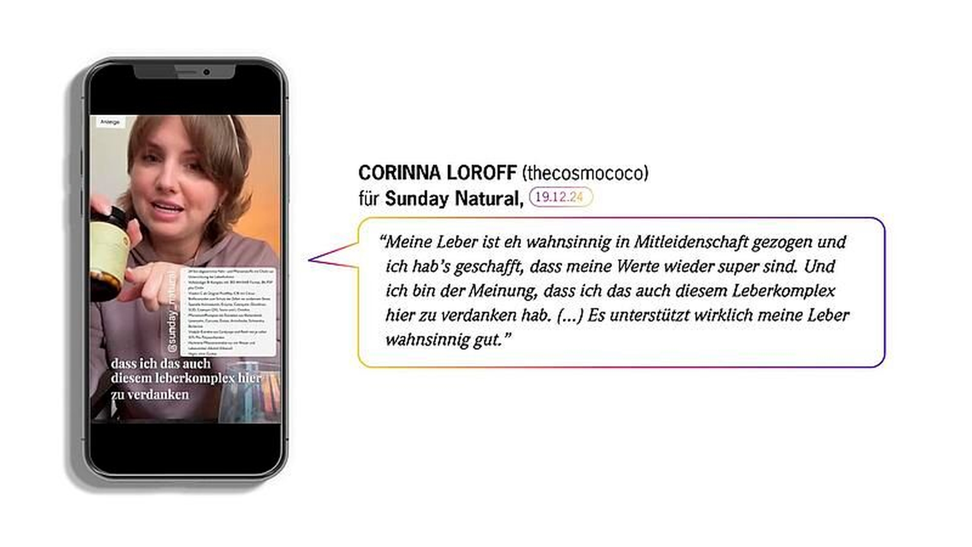 Klassische Heilungsversprechen: Die Influencerin Corinna Roloff (thecosmococo) berichtet in einem Instagram-Beitrag davon, dass ihre Leberwerte „wieder super sind”. Das habe sie auch dem Leberkomplex des Herstellers Sunday Natural zu verdanken. Die HCVO erlaubt nicht, mit der Heilung einer Krankheit zu werben.