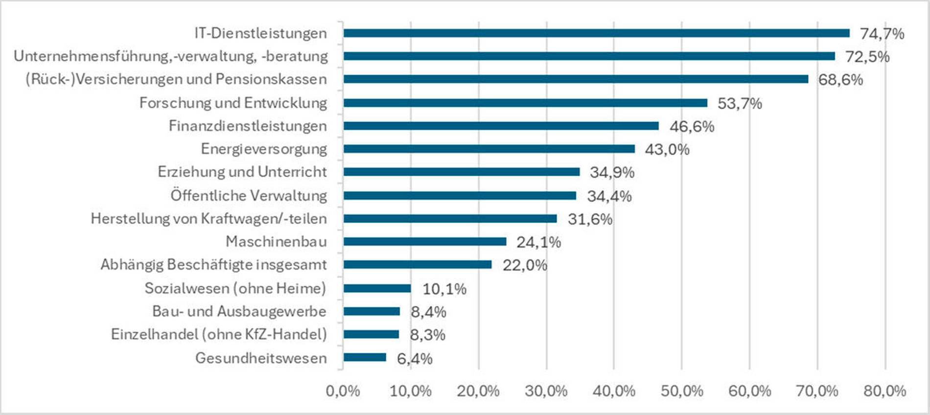 Fazit: Im Jahr 2023 war Homeoffice ähnlich verbreitet wie im Vorjahr, wurde jedoch an weniger Tagen genutzt. Dabei war das Gesundheitswesen mit einem Anteil von 6,4 Prozent der Beschäftigten, die zum Zeitpunkt der Befragung in den vergangenen vier Wochen mindestens einmal im Homeoffice gearbeitet hatten, Schlusslicht in der Homeoffice-Nutzung – noch hinter dem Einzelhandel mit 8,3 Prozent.