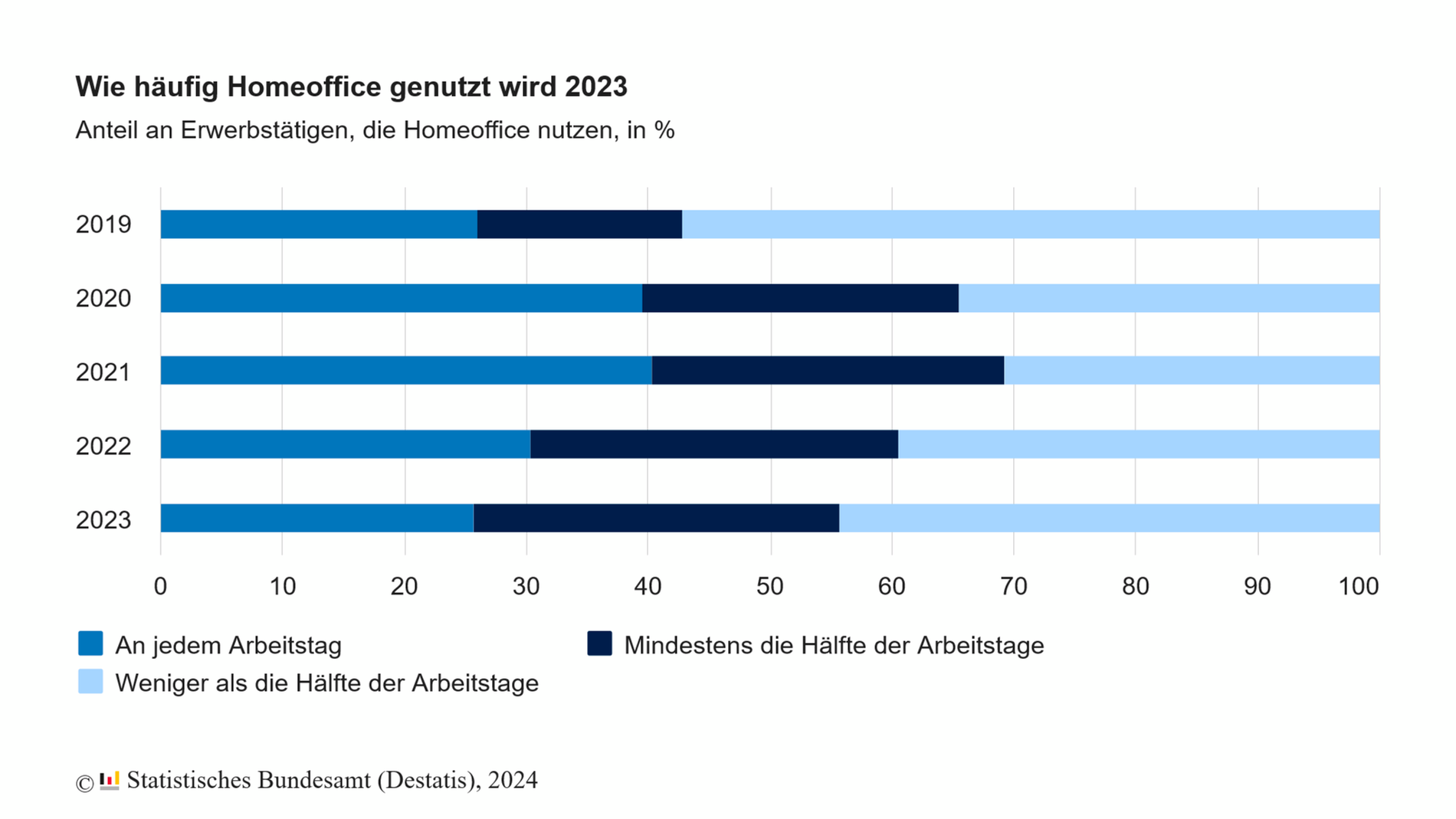 Homeoffice hat sich in Deutschland auch nach der COVID-19-Pandemie etabliert: 23,5 Prozent aller Erwerbstätigen waren im Jahr 2023 zumindest gelegentlich im Homeoffice. Damit war der Anteil nur geringfügig niedriger als im Jahr 2022 mit 24,0 Prozent und im Jahr 2021 mit 24,9 Prozent. Im März 2022 war die aufgrund der Corona-Pandemie eingeführte Homeoffice-Pflicht ausgelaufen.