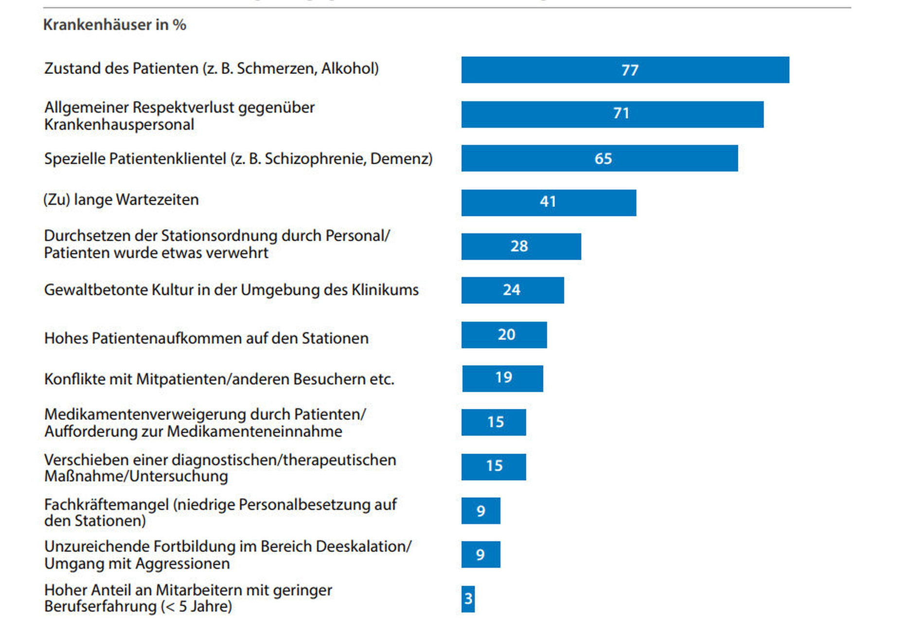 Als Hauptursachen nennen die befragten Kliniken in der aktuellen Umfrage des Deutschen Krankenhausinstituts (DKI) neben krankheitsbedingten Faktoren vor allem einen allgemeinen Respektverlust gegenüber dem Personal (71 Prozent) sowie lange Wartezeiten (41 Prozent).