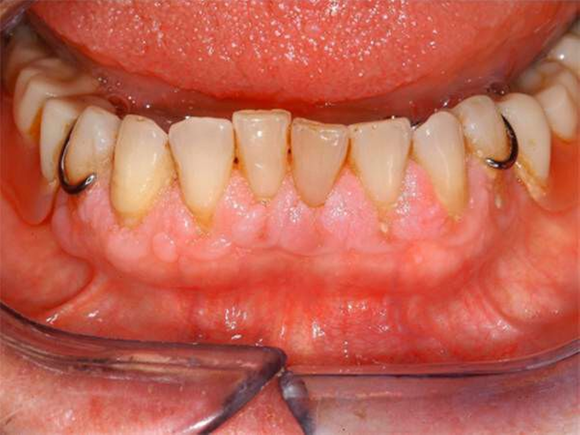 Orale Manifestationen im Zusammenhang mit der GPA waren bei der Patientin bis dahin nicht bekannt. Die hyperplastische Gingivitis wurde erstmalig durch den Hauszahnarzt im April 2015 diagnostiziert und mit einer geschlossenen Parodontaltherapie ohne adjuvante Antibiose behandelt.