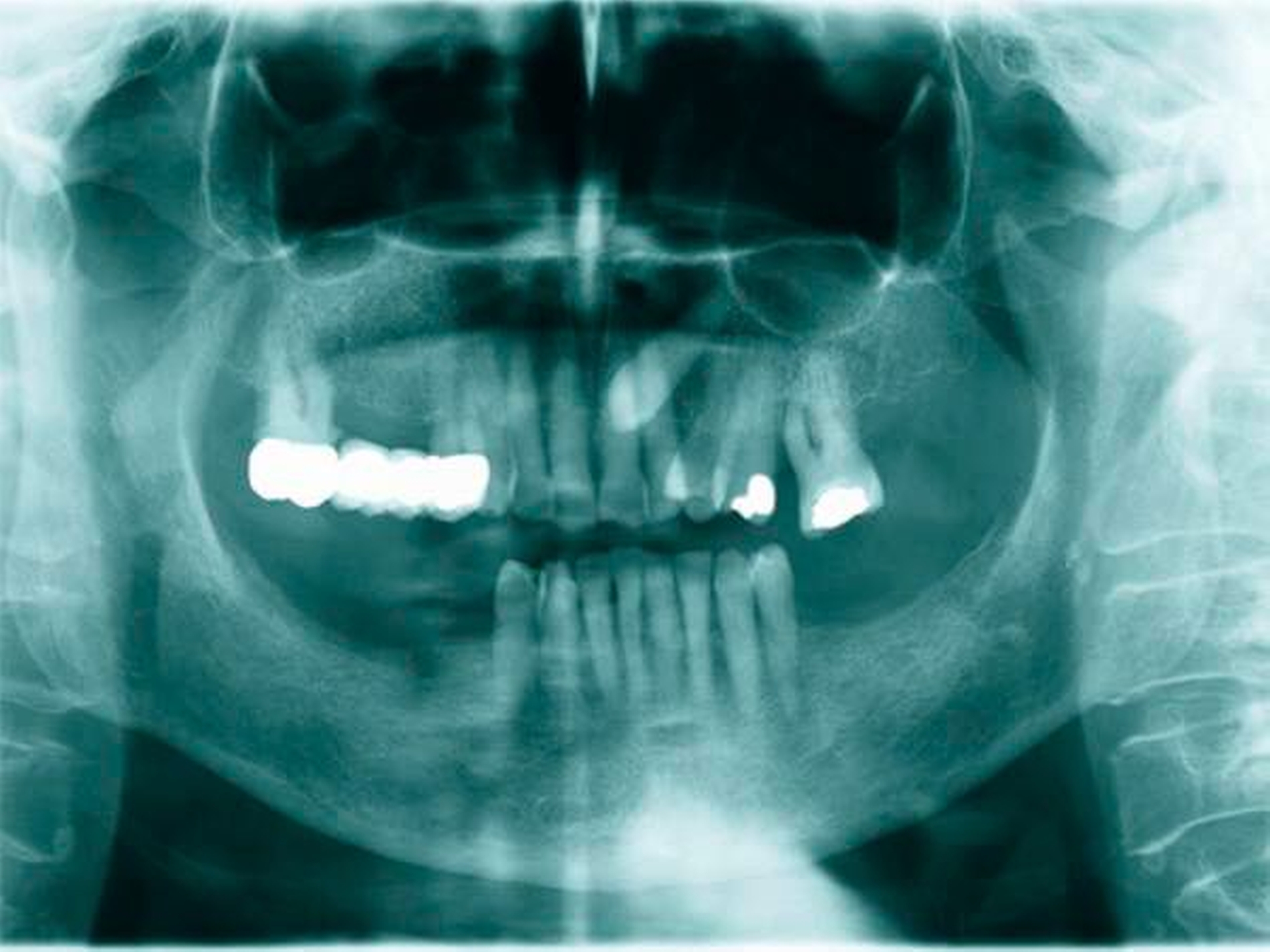 Aufgrund der schmerzhaften Gingivitis hatte die Patientin zudem Probleme mit der Nahrungsaufnahme. In der Panoramaschichtaufnahme (Abbildung 3) zeigte sich neben einem impaktierten Eckzahn ein Furkationsbefall der Molaren mit Konkrementen sowie ein altersentsprechender, generalisierter horizontaler Knochenabbau.