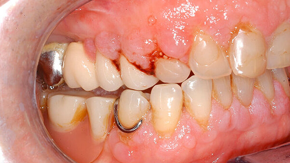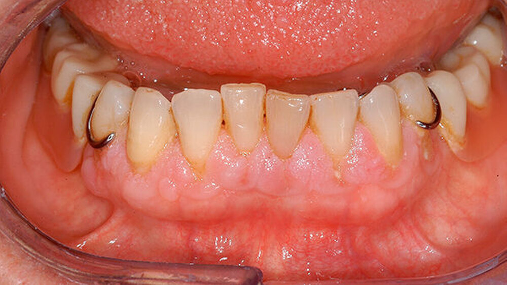 Als typische orale Manifestationen treten bei der GPA unspezifische erosive Läsionen der oralen Mukosa oder eine hyperplastische Gingivitis, wie hier beschrieben, auf. Differenzialdiagnostisch müssen medikamenten-induziierte Gingivahyperplasien