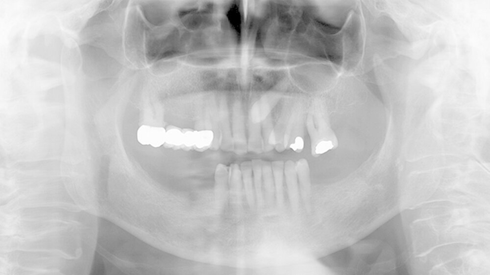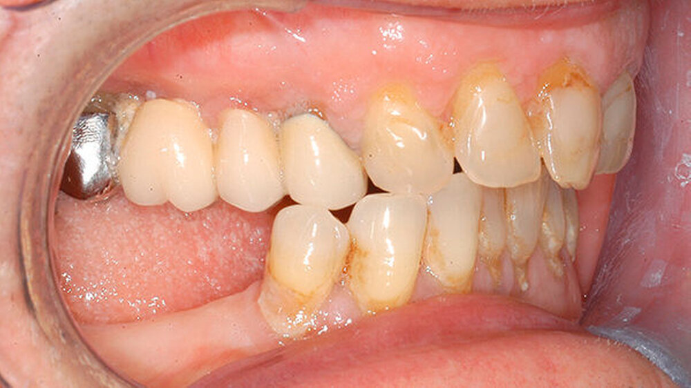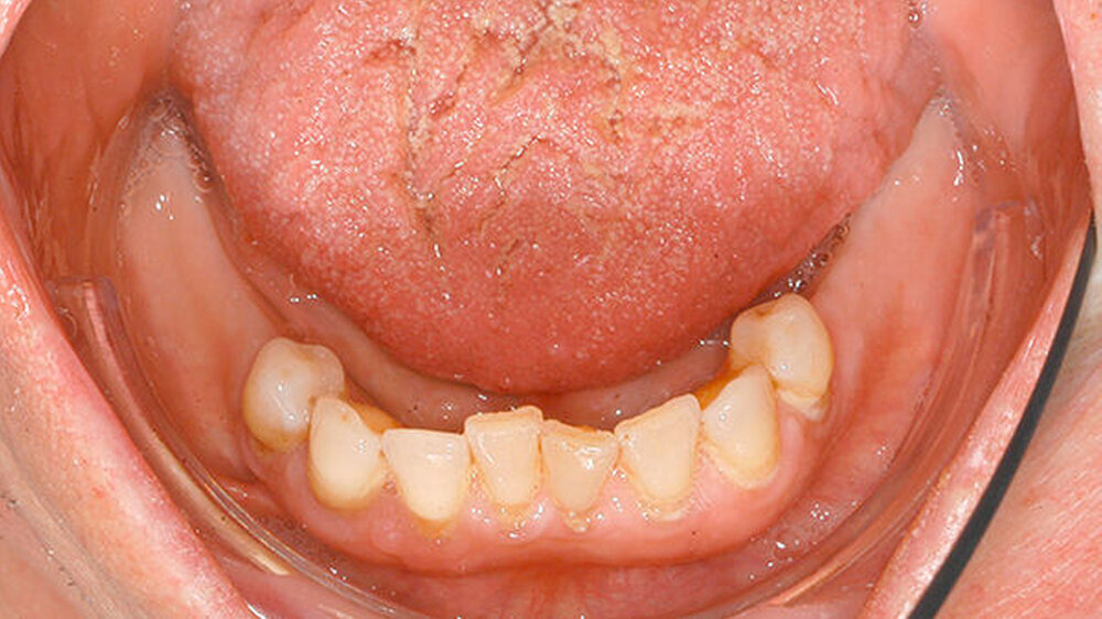 Aufgrund der schmerzhaften Gingivitis hatte die Patientin zudem Probleme mit der Nahrungsaufnahme. In der Panoramaschichtaufnahme (Abbildung 2) zeigt sich neben einem impaktierten Eckzahn ein Furkationsbefall der Molaren mit Konkrementen sowie ein altersentsprechender, generalisierter horizontaler Knochenabbau. Dennoch erschien uns das Volumen der Gingiva nach bereits erfolgter geschlossener Parodontaltherapie ungewöhnlich.