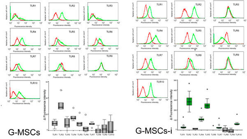 Die verwendeten Stammzellen zeigten alle geforderten und charakteristischen Merkmale der Stammzellen. In normalem Nährmedium erwies sich eine Expression auf Protein und m-RNA Ebene der TLRs 1, 2, 3, 4, 5, 6, 7 und 10. Das Entzündungsmedium erhöhte signifikant die Expression der TLRs 1, 2, 4, 5, 7 und 10 und verminderte die Expression des TLR 6 (p≤0.05, Wilcoxon-Signed-Ranks-Test) [Fawzy-El-Sayed et al., 2015] (Abbildung 6).